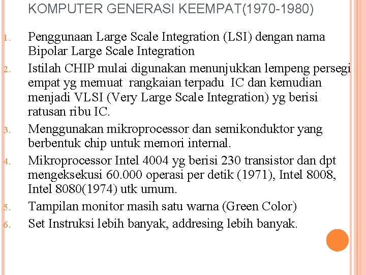 KOMPUTER GENERASI KEEMPAT(1970 -1980) 1. 2. 3. 4. 5. 6. Penggunaan Large Scale Integration (LSI) dengan nama Bipolar Large Scale Integration Istilah CHIP mulai digunakan menunjukkan lempeng persegi empat yg memuat rangkaian terpadu IC dan kemudian menjadi VLSI (Very Large Scale Integration) yg berisi ratusan ribu IC. Menggunakan mikroprocessor dan semikonduktor yang berbentuk chip untuk memori internal. Mikroprocessor Intel 4004 yg berisi 230 transistor dan dpt mengeksekusi 60. 000 operasi per detik (1971), Intel 8008, Intel 8080(1974) utk umum. Tampilan monitor masih satu warna (Green Color) Set Instruksi lebih banyak, addresing lebih banyak.