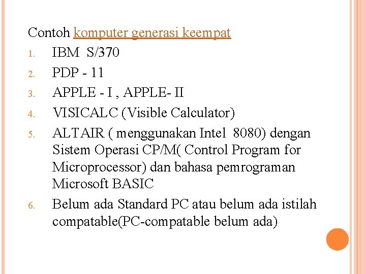 Contoh komputer generasi keempat 1. IBM S/370 2. PDP - 11 3. APPLE - I , APPLE- II 4. VISICALC (Visible Calculator) 5. ALTAIR ( menggunakan Intel 8080) dengan Sistem Operasi CP/M( Control Program for Microprocessor) dan bahasa pemrograman Microsoft BASIC 6. Belum ada Standard PC atau belum ada istilah compatable(PC-compatable belum ada)