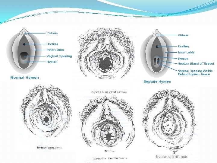 Variasi Morfologi Hymen �Annular Hymen �Fimbria Hymen �Seminular/crescent Hymen �Septate Hymen �Cibriform Hymen �Imperforate Hymen �Micro perforate Hymen