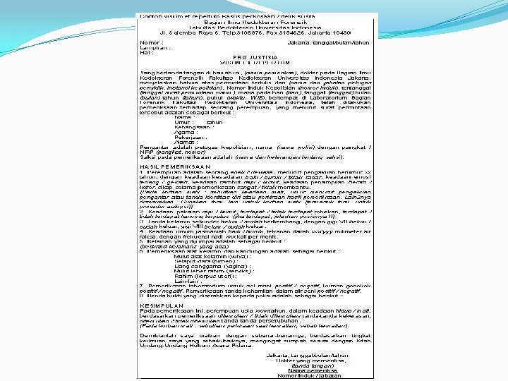 PEMERIKSAAN TERHADAP TERTUDUH PELAKU PERKOSAAN Hal yang penting diperhatikan : �Jelaskan pemeriksaan yang akan dilakukan & kemungkinan hasil pemeriksaan bisa memberatkan dirinya. �Persetujuan tertulis �Jika tidak mendapatkan persetujuan dicatat hanya temuan dari pemeriksaan luar dan hasilnya dikirimkan disertai dengan keterangan bahwa tertuduh menolak untuk diperiksa. �waktu, tempat dan tanggal pemeriksaan harus dicatat.