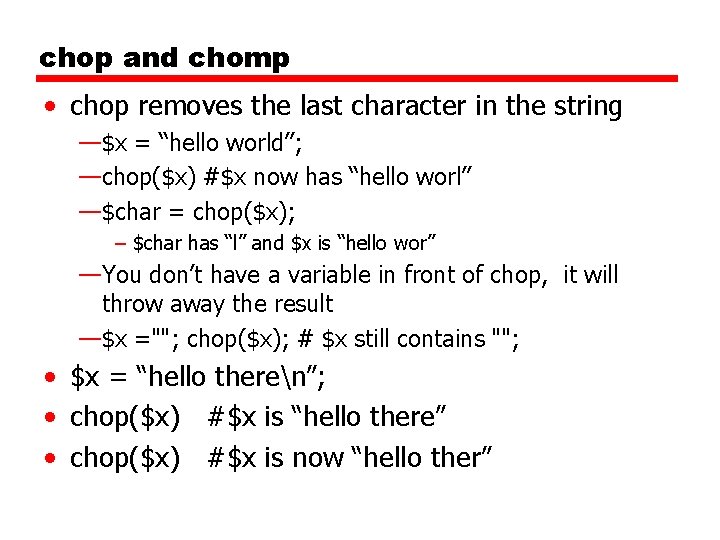 chop and chomp (2) • • chomp only removes the newline character $x = “hello theren”; chomp($x) #$x is “hello there” chomp($x) # $x is still “hello there”