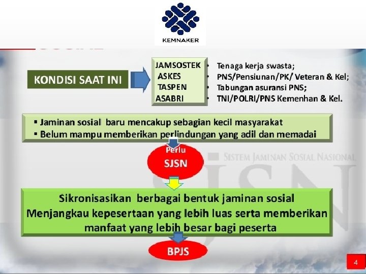 Sistem Jaminan Sosial Nasional (SJSN) 3 Azas Kemanusiaa n Manfaat Keadilan sosial bagi seluruh rakyat Indonesia 5 Program Jaminan Kesehatan Jaminan Kecelakaan Kerja Jaminan Hari Tua Jaminan Pensiun Jaminan Kematian 9 Prinsip Kegotong-royongan Nirlaba Keterbukaan Kehati-hatian Akuntabilitas Portabilitas Kepesertaan wajib Dana amanat Hasil pengelolaan dana digunakan seluruhnya untuk pengembangan program dan sebesarnya untuk kepentingan peserta