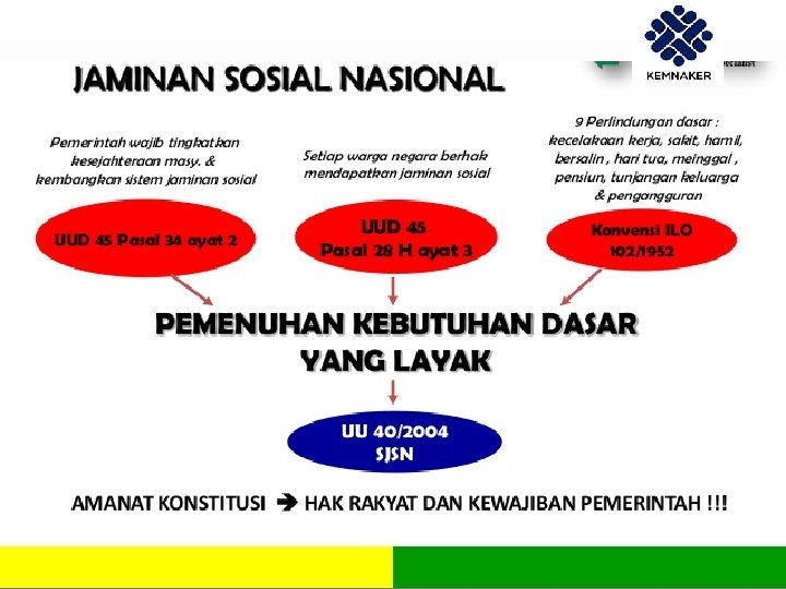 Sistem Jaminan Sosial Nasional Hak konstitusional setiap orang + Wujud tanggung jawab negara Konvensi ILO 102 tahun 1952 • Standar minimal Jaminan Sosial (Tunjangan kesehatan, tunjangan sakit, tunjangan pengangguran, tunjangan hari tua, tunjangan kecelakaan kerja, tunjangan keluarga, tunjangan persalinan, tunjangan kecacatan, tunjangan ahli waris Pasal 28 H ayat 3 UUD 45 • “Setiap orang berhak atas Jaminan Sosial yang memungkinkan pengembangan dirinya secara utuh sebagai manusia yang bermanfaat". Pasal 34 ayat 2 UUD 45 • "Negara mengembangkan sistem jaminan sosial bagi seluruh rakyat dan memberdayakan masyarakat yang lemah dan tidak mampu sesuai dengan martabat kemanusiaan".