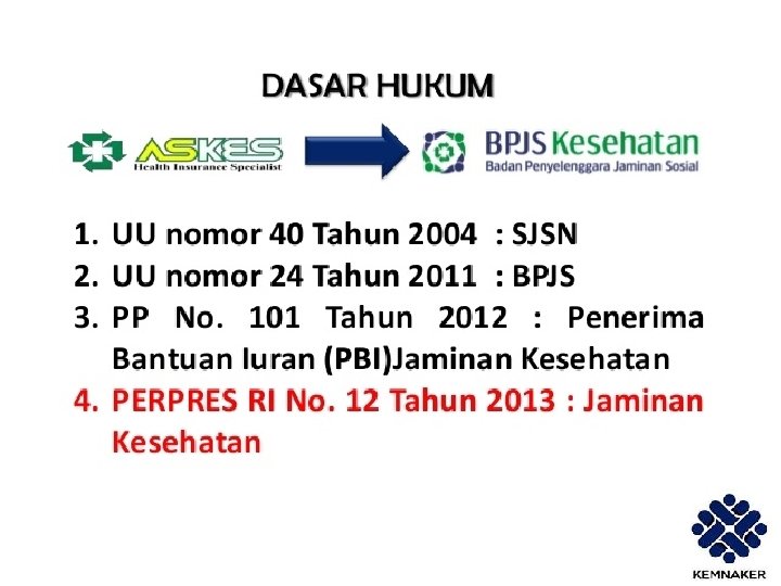 DASAR HUKUM BPJS KETENAGAKERJAAN • UNDANG-UNDANG NO 3 TAHUN 1992 ttg Jaminan Sosial Tenaga Kerja • UNDANG-UNDANG NO 40 TAHUN 2004 ttg Sistem Jaminan Sosial Nasional • UNDANG-UNDANG NO 24 TAHUN 2011 ttg Badan Penyelenggara Jaminan Sosial • PERATURAN PEMERINTAH NO 14 TAHUN 1993 ttg Penyelenggaraan Program Jaminan Sosial Tenaga Kerja • PERATURAN PEMERINTAH NOMOR 84 TAHUN 2013 ttg Perubahan Kesembilan atas Peraturan Pemerintah No. 14 tahun 1993 ttg Penyelenggaraan Program Jaminan Sosial Tenaga Kerja • PERATURAN PEMERINTAH NOMOR 86 TAHUN 2013 ttg Tata cara pengenaan sangsi Administratif kpd pemberi kerja selain penyelenggara negara & setiap org, selain pemberi kerja, pekerja & Penerima Bantuan Iuran dlm Penyelenggaraan Jamsos • PERATURAN PRESIDEN NOMOR 109 TAHUN 2013 ttg Penahapan Kepesertaan Program Jamsos • KEPPRES NO 22 TAHUN 1993 ttg Penyakit yg Timbul Akibat Hubungan Kerja • PERMEN-12/MEN/2007 ttg Juknis Pendaftaran Kepesertaan, pembayaran iuran, pembayaran santunan & pembayaran jamsos Tenaga Kerja • PERMEN-20 TAHUN 2012 ttg Perubahan atas peraturan menteri tenaga kerja dan transmigrasi nomor per-12/men/vi/2007 tentang petunjuk teknis pendaftaran kepesertaan, pembayaran iuran, pembayaran santunan dan pelayanan jaminan sosial tenaga kerja
