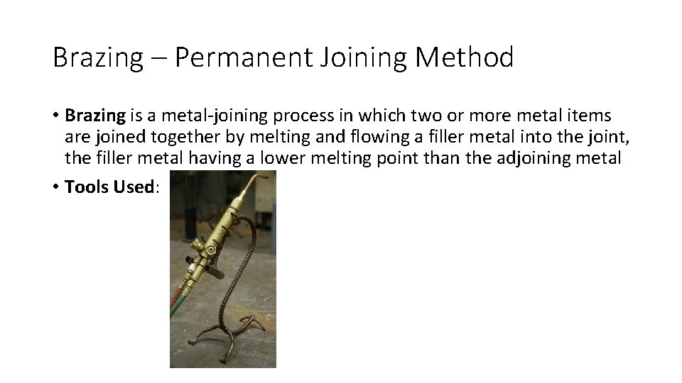 Brazing – Permanent Joining Method • Brazing is a metal-joining process in which two or more metal items are joined together by melting and flowing a filler metal into the joint, the filler metal having a lower melting point than the adjoining metal • Tools Used: