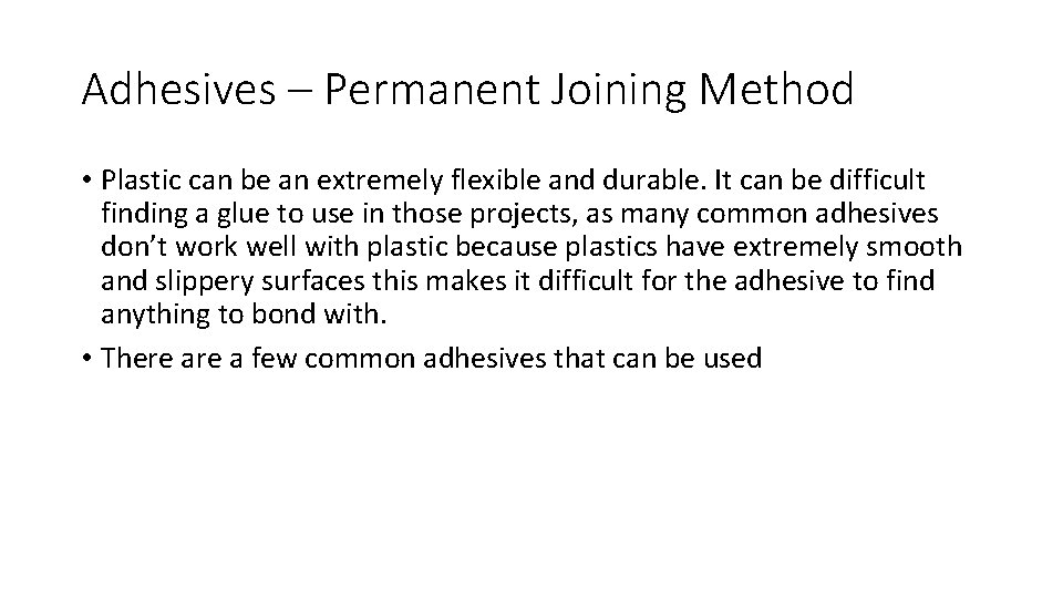 Adhesives – Permanent Joining Method • Plastic can be an extremely flexible and durable. It can be difficult finding a glue to use in those projects, as many common adhesives don’t work well with plastic because plastics have extremely smooth and slippery surfaces this makes it difficult for the adhesive to find anything to bond with. • There a few common adhesives that can be used