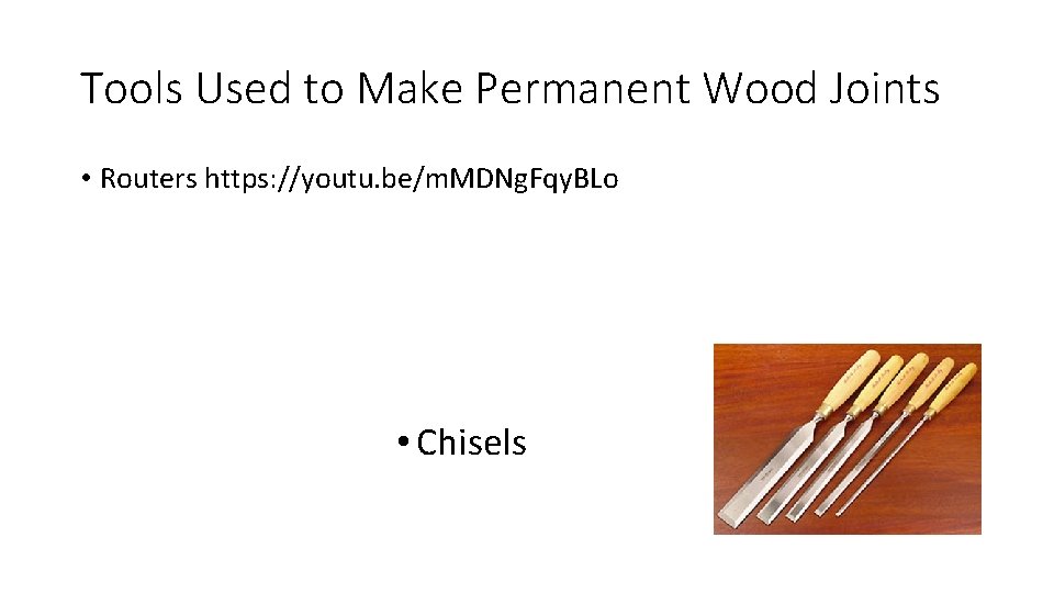 Tools Used to Make Permanent Wood Joints • Routers https: //youtu. be/m. MDNg. Fqy. BLo • Chisels