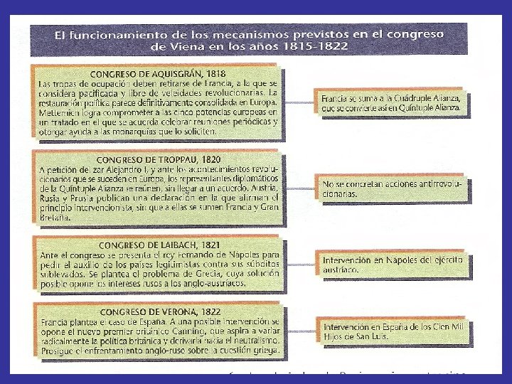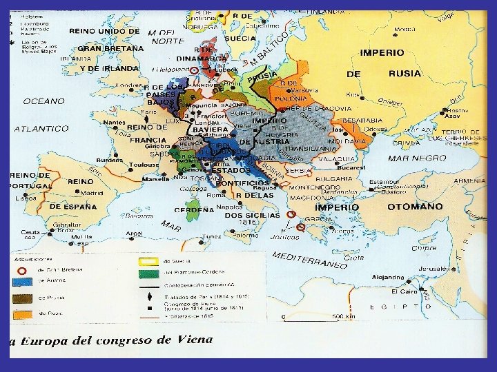 CONSECUENCIAS DEL CONGRESO DE VIENA. • Reordenación del Mapa Europeo. • Se aplican los principios de legitimidad y de un “equilibrio Europeo”, se rechaza el principio de nacionalidad. • A partir de 1815 se acepta a Francia como miembro titular de los reinos legítimos de Europa. • Se conforma la llamada Santa Alianza organismo formado por los Reinos de Austria, Rusia, Prusia e Inglaterra destinada a evitar brotes revolucionarios.
