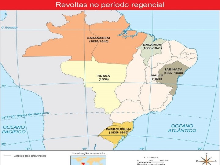 Cabanagem (1835 a 1840) Grão-Pará -Revoltosos: índios, negros e cabanos (pessoas que viviam em cabanas às margens dos rios) Liberais. -Causas: péssimas condições de vida da população mais pobre e domínio político e econômico dos grandes fazendeiros. Balaiada (1838 a 1841) Maranhão -Revoltosos: pessoas pobres da região, artesãos, escravos e fugitivos (quilombolas) Liberais. - Causas: vida miserável dos pobres (grande parte da população) e exploração dos grandes comerciantes e produtores rurais.