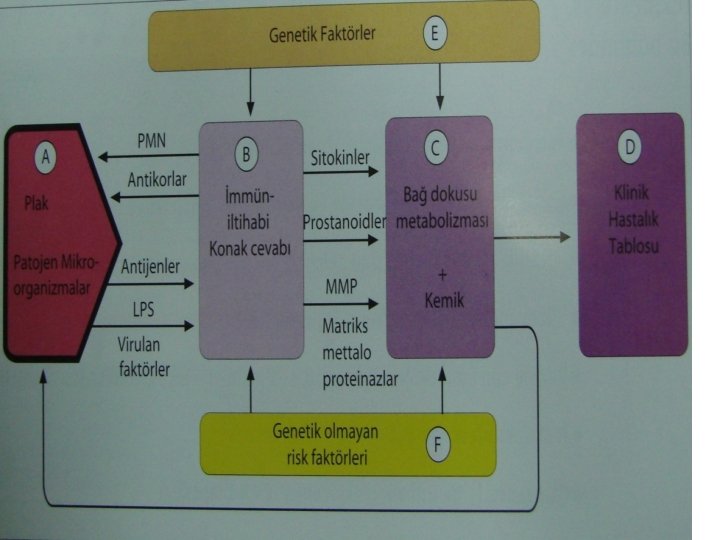 Periodontal Hastalıklarda Risk Faktörler � Gingivitis; gingival marginine kolonize olan mikroorganizmalar ve bu mikroorganizmaların etkilerini artıran lokal ve genel faktörlerin etkileşimi sonucu oluşan dişetinin iltihabi bir hastalığıdır. � Periodontitis: tedavi edilmeyen gingivitisin ilerlemesi ile destek periodontal dokuların (alveol kemiği ve periodontal ligamentin) yıkımıyla sonuçlanabilen infeksiyoz bir hastalıktır.