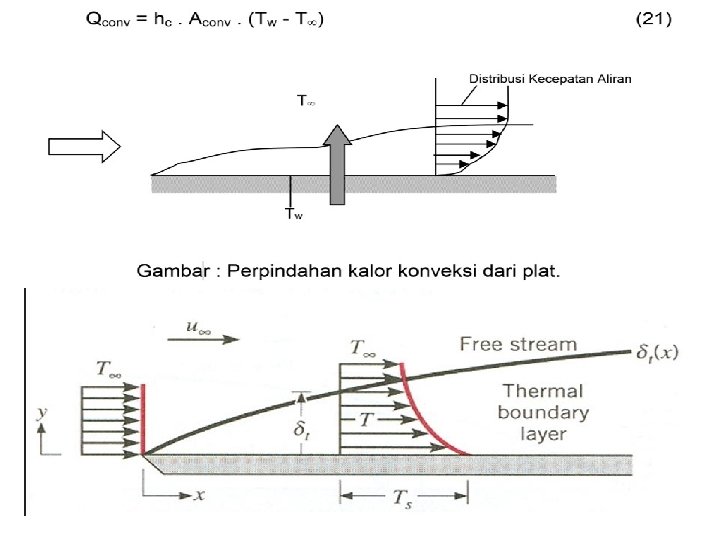 (PERPINDAHAN PANAS KONVEKSI) Ts > PRINSIP KONVEKSI T~ Fluida bergerak T~ q Ts Jika benda bersuhu tinggi berada pada lingkungan fluida bersuhu rendah maka akan terjadi perpindahan panas secara konveksi dari benda ke lingkungan. Hal ini terjadi karena pengaruh gerakan pertikel-partikel fluida. Perpindahan panas konveksi diklasifikasikan : Ø Konveksi bebas Terjadi karena perbedaan kerapatan yang disebabkan gradien suhu Ø Konveksi paksa Gerakan pencampuran karena pengaruh mekanis