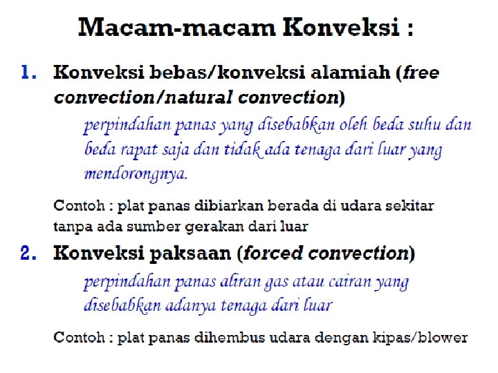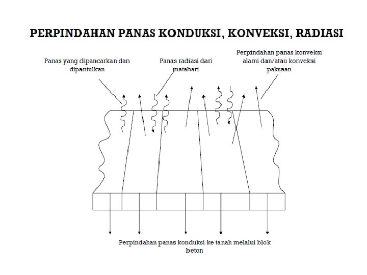 Konduksi Konveksi Radiasi Perpindahan Kalor melalui perantara / perpindahan kalor pada suatu zat tanpa disertai perpindahan partikelnya Perpindahan Kalor melalui aliran , dimana zat perantaranya ikut berpindah Perpindahan Kalor tanpa melalui zat perantara, biasanya disertai cahaya