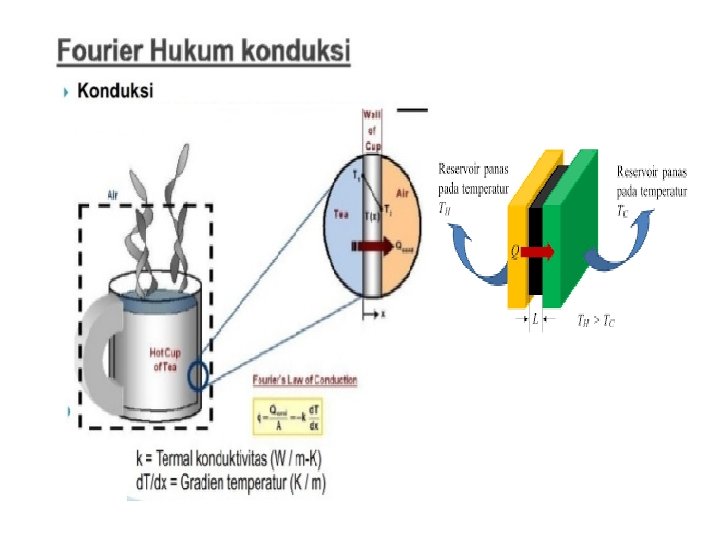 (PERPINDAHAN PANAS KONDUKSI) Laju perpindahan panas diberikan sesuai hukum Fourier : dimana : k A T x = konduktivitas termal = luasan bidang perpindahan panas = perbedaan suhu = jarak bidang perpindahan panas = gradien suhu Tanda minus menunjukkan kalor mengalir ke tempat yang lebih rendah dalam skala suhu. Konduktivitas termal/panas menunjukkan : q Ukuran kemampuan material untuk menghantarkan energi q Energi yang dihantarkan tiap unit waktu, tiap satuan panjang dan tiap beda suhu