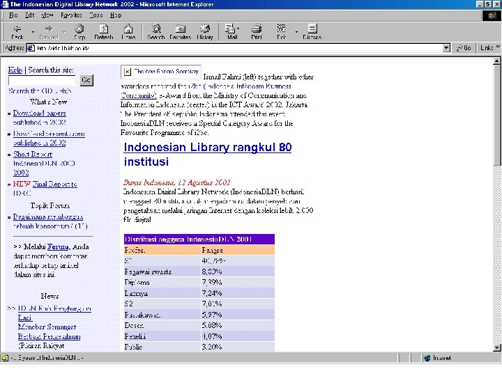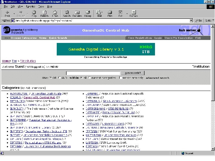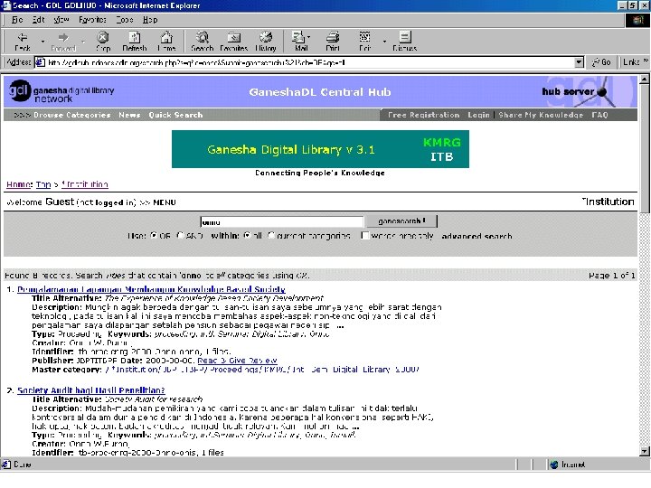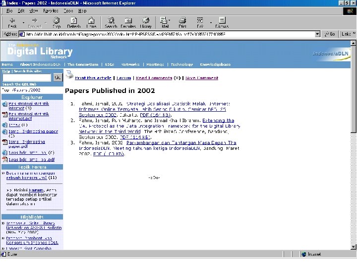 Tools Server n Web server (apache) n Indexer (Wais/Isis, Harvest, Swish-E, Dienst, Isite) n CGI (YNIS, wwwwais, perl scripts, PHP, dll) n Database (POSTGRESQL, Mysql, Msql, dll) n OS (Unix Free. BSD, Linux) n Mail achiving (hypermail, Mhon. Arc, Procmail) Client n Web Browser (IE, Netscape) n Adobe Acrobat reader http: //sunsite. berkeley. edu/Tools n All Free, can be downloaded from Internet
