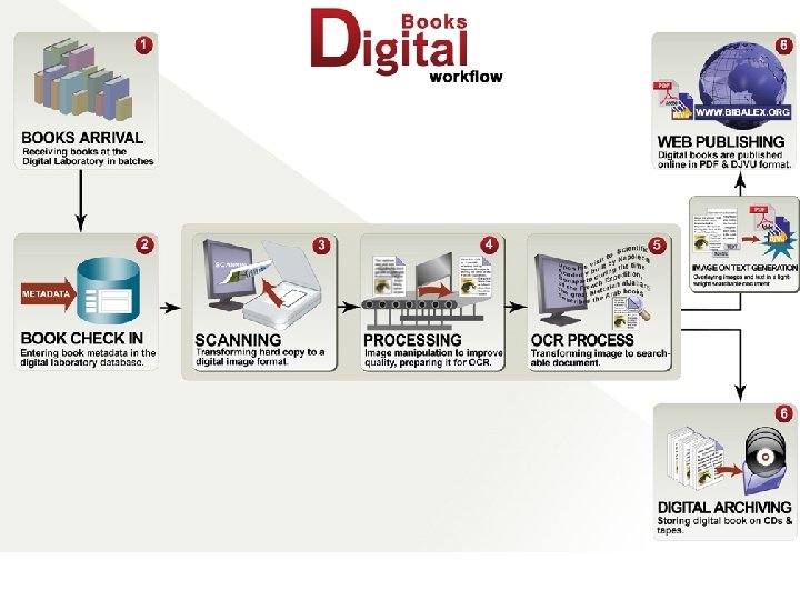 Proses Identifikasi buku Pemilihan buku Meta Data Proses pemindaian Pemindaian Ipengolahan gambar & QC Bahan digital Penerbitan