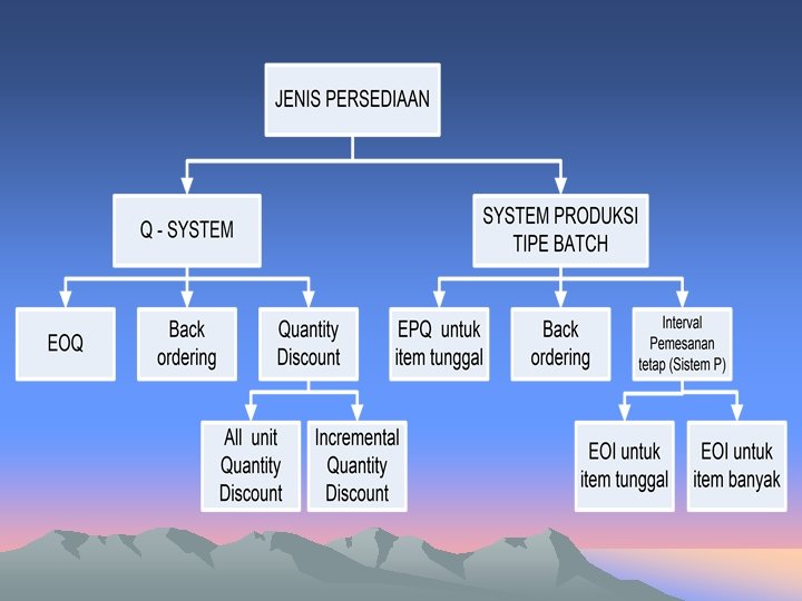 Tujuan Persediaan • • Menjamin tersedianya sumbe daya yang tepat, dalam kuantitas yang tetap dan pada waktu yang tepat atau Untuk meminimumkan biaya total melalui penentuan apa, nerapa dan kapan pesanan dilakukan secara optimal.