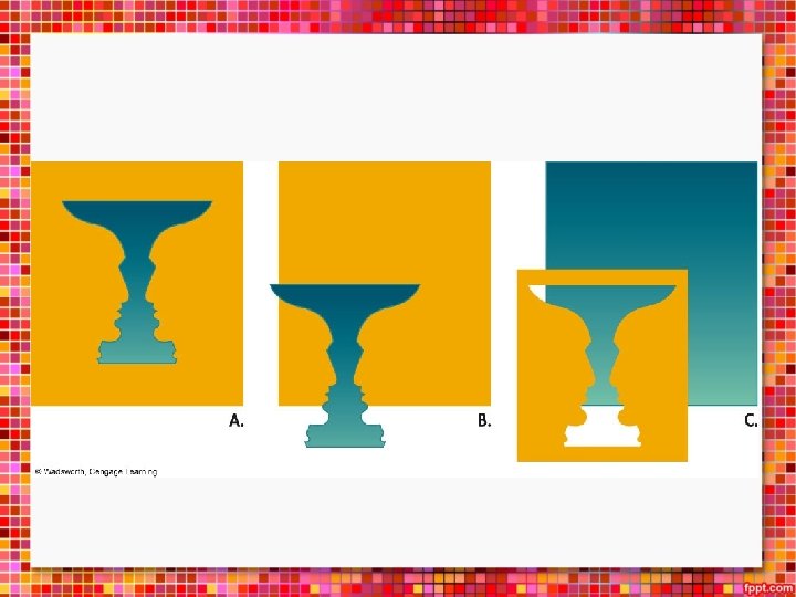 Hukum Figure Ground • Dalam mempersepsi terdapat dua bagian perceptual field yaitu figure and ground • Figure adalah bagian dominan dan merupakan fokus perhatian • Ground adalah yang melatarbelakangi / melengkapi (tidak menjadi fokus persepsi) • Antara figure dan ground dapat berpindah atau bertukar peran satu sama lain