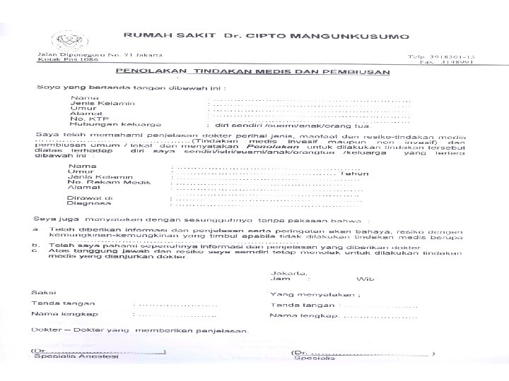 INFORMED CONSENT yang adekwat meliputi unsur-unsur • diagnosa – – • • tindakan yang diusulkan prosedur alternative (kalau ada) resiko apa yang akan timbul apabila tindakan tidak dilaksanakan resiko yang terkandung dalam prosedur tersebut kemampuan pasien untuk mengambil keputusan (decision making capacity) kesukarelaan pasien untuk memberikan ijin