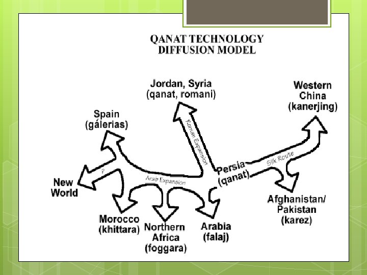 Changes in Farming and Irrigation Techniques One possibility for the diffusion of qanat technology. “While the above diffusion model is nice and neat, human activities are rarely so orderly. Qanat technology may have been introduced into the central Sahara and later into western Sahara by Judaized Berbers fleeing Cyrenaica during Trajan's persecution in 118 AD. Since the systems in South America may predate the Spanish entry into the New World, their development may have occurred independently from any Persian influence. The Chinese, while acknowledging a possible Persian connection, find an antecedent to the qanats of Turpan in the Longshouqu Canal (constructed approximately 100 BC). The Romans used qanats in conjunction with aqueducts to serve urban water supply systems (a qanat-aqueduct system was built in Roman Lyons). A Roman qanat system was also constructed near Murcia in southeastern Spain. The Catalan qanat systems (also in Spain) do not seem to have been related to Islamic activity and are more likely later constructions, based on knowledge of Roman systems in southern France. ” http: //www. waterhistory. org/histories/qanats/