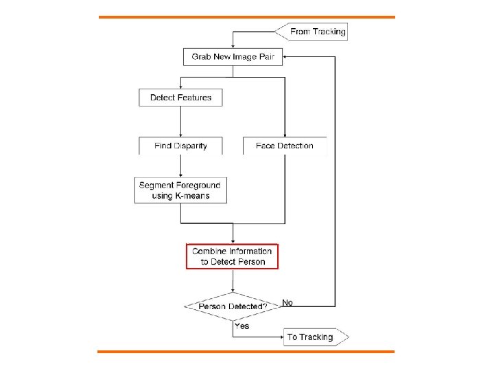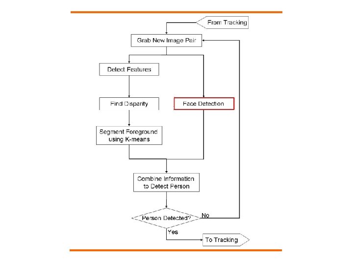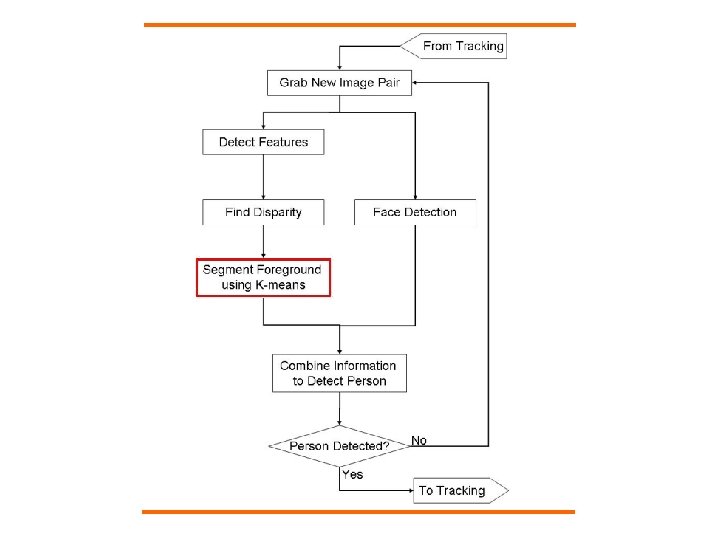 Our Approach • Inspired by the work of Chen and Birchfield [12] • Stereo based Lucas-Kanade [9, 10] – Detect and track feature points – Calculate sparse disparity map • Segment scene using k-means Clustering • Detect faces using Viola-Jones detector [11] • Detect Person using results of k-means and Viola-Jones • Track Person using modified detection procedure