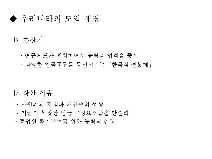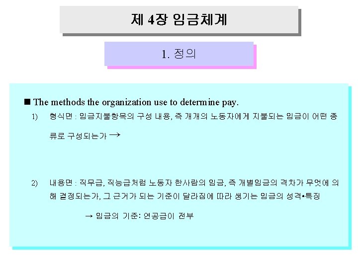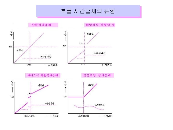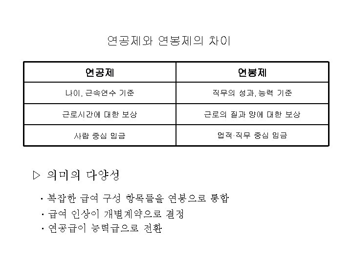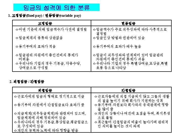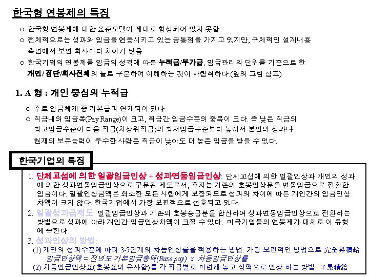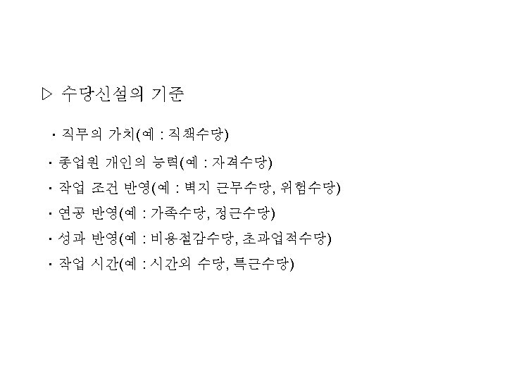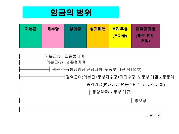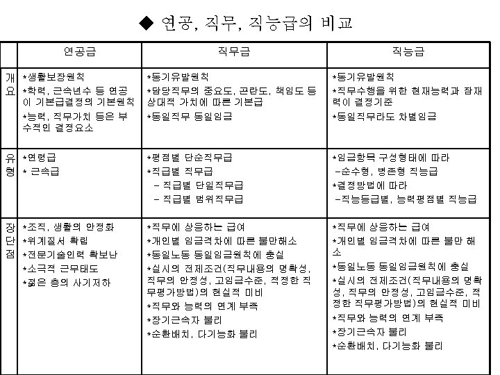 기본급 • time - based system : 근속 도는 연령 • job - based system : 직무가치 • skill - based system : skill, knowledge, competency 임금인상 • time or life - based system : base-up, 효용 • performance - based system : merit, incentives, physical outputs • skill - based system : 능력 또는 skill 향상