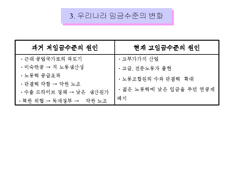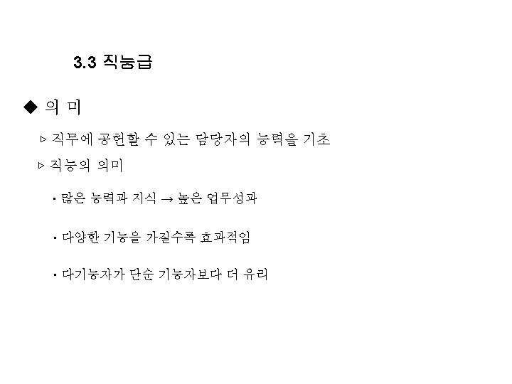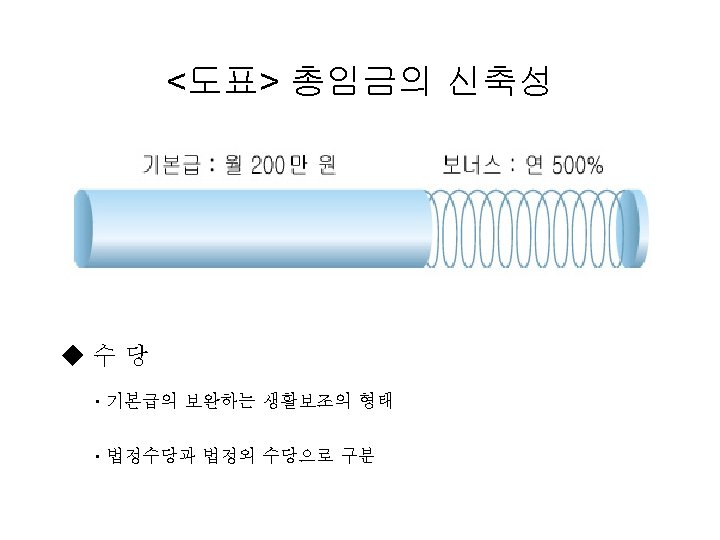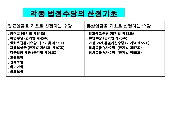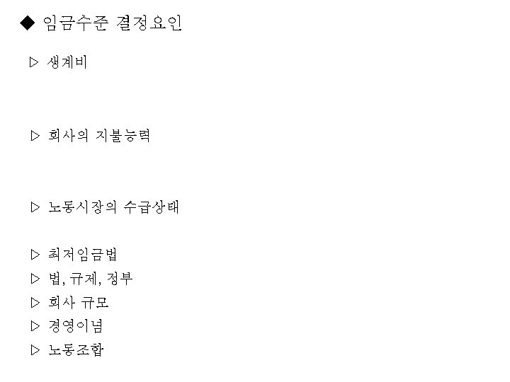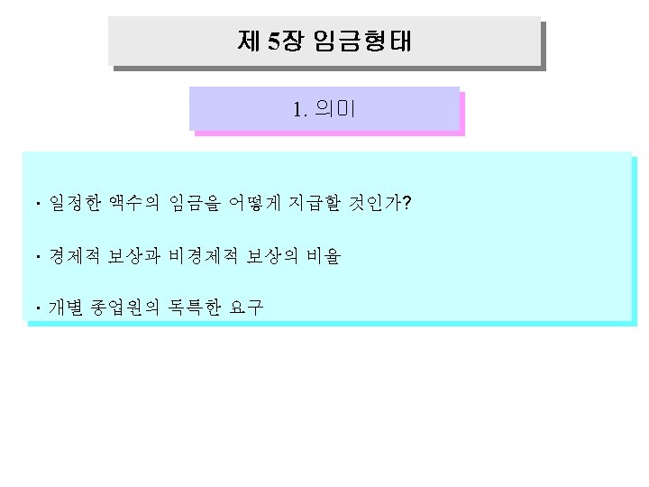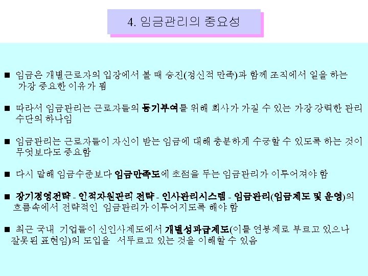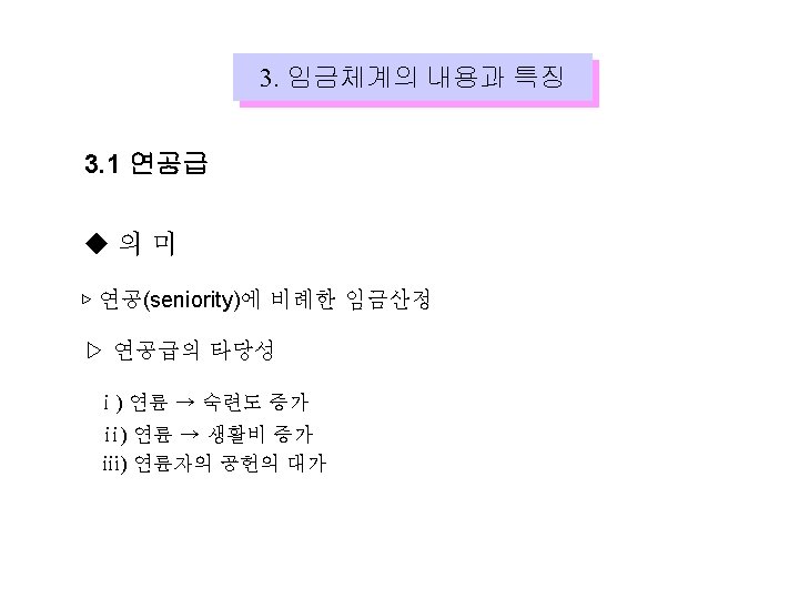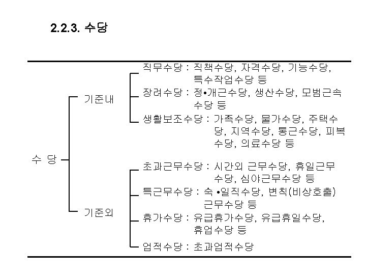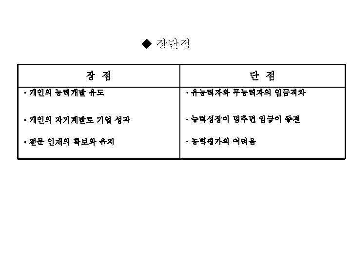 기본급 • time - based system : 근속 도는 연령 • job - based system : 직무가치 • skill - based system : skill, knowledge, competency 임금인상 • time or life - based system : base-up, 효용 • performance - based system : merit, incentives, physical outputs • skill - based system : 능력 또는 skill 향상