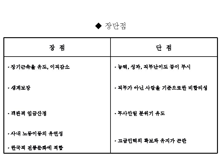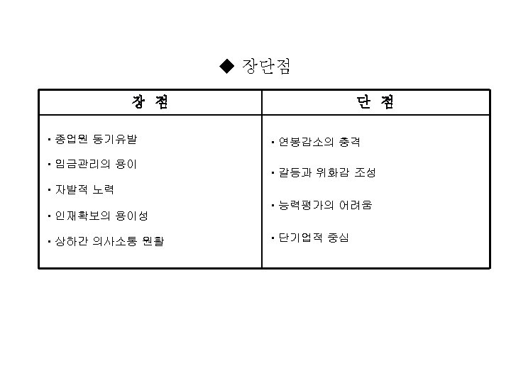 Merit 시스템에 대한 찬반의견 Pros : • Employ prefer that their pay be based upon their performance. • If an average wage is given to each employee, then high performers, the people that the organization wishes to retain, will be dissatisfied with their pay and may leave the organization. • If merit pay is not included as a component of the total compensation package, then performance is not being rewarded, and only membership is being rewarded. This provides an incentive for poor performers to remain with the organization. • Merit pay plans are based upon a number of well-established theories(expectancy theory and reinforcement theory). • There have been a number of empirical studies demonstrating the effectiveness of merit pay. • Merit pay will work when it is administered properly. • Motivation through pay is one way to increase productivity in the United States. • There are valid methods of performance appraisal that can be used. In addition, the measurement of performance is becoming easier, with the advent of management information system and the continuing decentralization and diversification of American companies. • Merit pay is increasingly important during periods of inflation. • There is more openness and employee participation in some pay plans. • Merit pay distinguishes between high-and low-performing employees. • Merit pay is an excellent source of performance feedback to the employee.