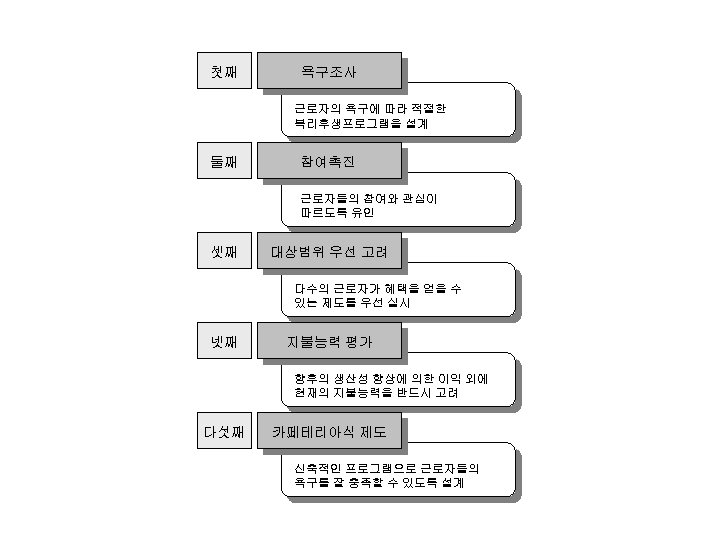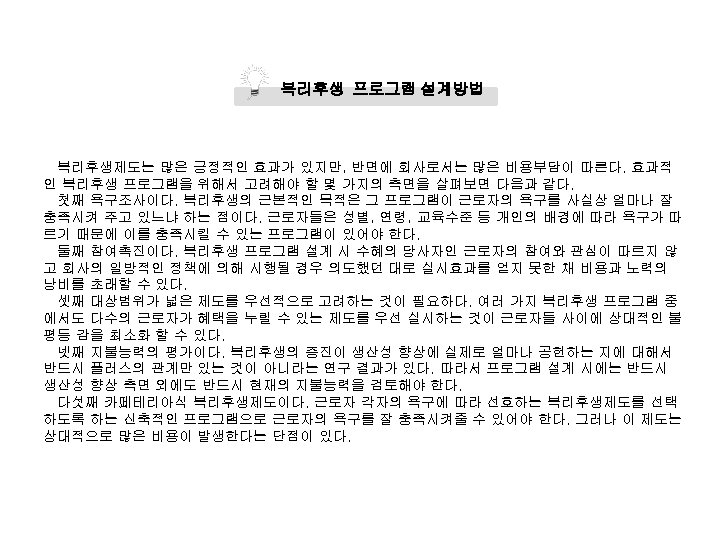 Profit sharing • 목적 - To install a sense of partnership - To serve as a group incentive - To provide to give greater benefits to employees without incurring fixed commitment - A desire to attract better employees and reduce turnover - A desire to promote thrift - A desire for better employer - employee relations • 지불방법 - Cash - Payment Plan - Deferred - Payment Plan - combination - Payment Plan