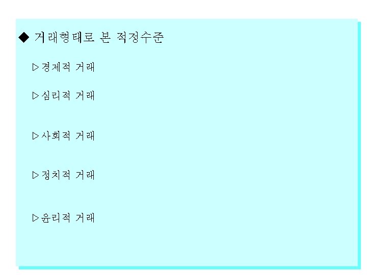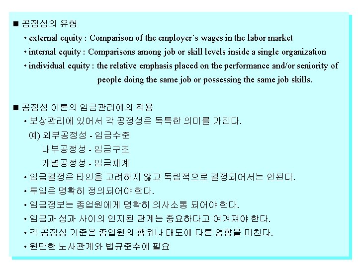 공정성 이론 기본모형 Person Outcomes Other 비교 Inputs Outcomes Inputs Person > Other, inequitably overpaid Person = Other, equitably paid Person < Other, inequitably underpaid Outcomes : pay, working conditions, security, recognition, achievement etc. Input : skill, education, experience, seniority, effort, performance, job level etc.