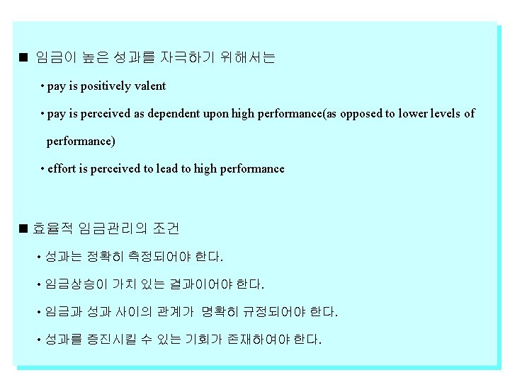 Merit 시스템 목적 To use pay to motivate high levels of performance by increasing the instrumentality perceptions of employees. Merit Pay에 관한 관점 • merit pay는 지속적 관리가 필요하다. • Doing more with less • 임금과 성과 사이의 “인지된” 관계를 이해하는 것이 실질적 관계만큼 중요하다.