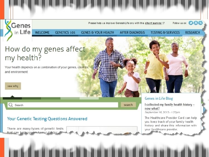 personal genetics education project (link) Impact on Family Early adopter sister You Skeptical brother Dad already signed up to get sequenced Mom the worrier Grandpa says no way! Crazy Uncle Bill Aunt Erma worried about losing her insurance because of her son’s DNA sequence Your kids Grandma is gone, but a sample of her DNA still exists… Cousin Betty wants to donate her sequence to science and make it totally public Your potential kid?