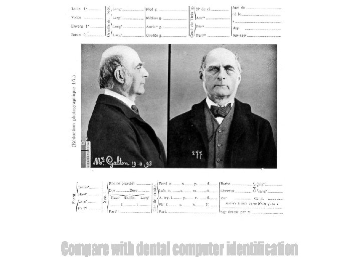 Biometrics/anthrometry A scientific system for personal identification was first introduced in France in 1883. Alphonse Bertillon’s anthropometric system for personal identification was based on the hypothesis that the human skeleton is stable from the age of 21 years. Eleven different measurements – among them height, embracing width and the ear – was completed by a ”portrait parlé ”, i. e. a verbal description of the face. Alphonse Bertillon 1853 - 1914