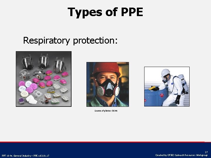 Types of PPE Respiratory protection: Source of photos: OSHA PPT 10 -hr. General Industry – PPE v. 03. 01. 17 27 Created by OTIEC Outreach Resources Workgroup
