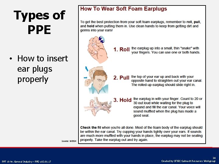 Types of PPE • How to insert ear plugs properly Source: NIOSH PPT 10 -hr. General Industry – PPE v. 03. 01. 17 38 Created by OTIEC Outreach Resources Workgroup