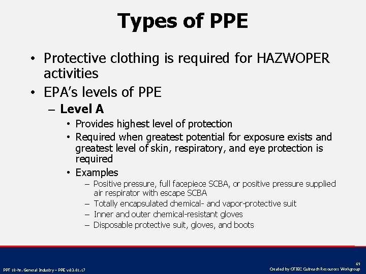 Types of PPE • Protective clothing is required for HAZWOPER activities • EPA’s levels of PPE – Level A • Provides highest level of protection • Required when greatest potential for exposure exists and greatest level of skin, respiratory, and eye protection is required • Examples – Positive pressure, full facepiece SCBA, or positive pressure supplied air respirator with escape SCBA – Totally encapsulated chemical- and vapor-protective suit – Inner and outer chemical-resistant gloves – Disposable protective suit, gloves, and boots PPT 10 -hr. General Industry – PPE v. 03. 01. 17 49 Created by OTIEC Outreach Resources Workgroup