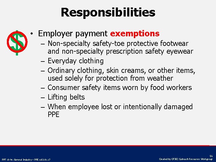 Responsibilities $ • Employer payment exemptions – Non-specialty safety-toe protective footwear and non-specialty prescription safety eyewear – Everyday clothing – Ordinary clothing, skin creams, or other items, used solely for protection from weather – Consumer safety items worn by food workers – Lifting belts – When employee lost or intentionally damaged PPE PPT 10 -hr. General Industry – PPE v. 03. 01. 17 56 Created by OTIEC Outreach Resources Workgroup