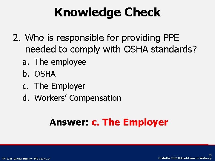 Knowledge Check 2. Who is responsible for providing PPE needed to comply with OSHA standards? a. b. c. d. The employee OSHA The Employer Workers’ Compensation Answer: c. The Employer PPT 10 -hr. General Industry – PPE v. 03. 01. 17 59 Created by OTIEC Outreach Resources Workgroup