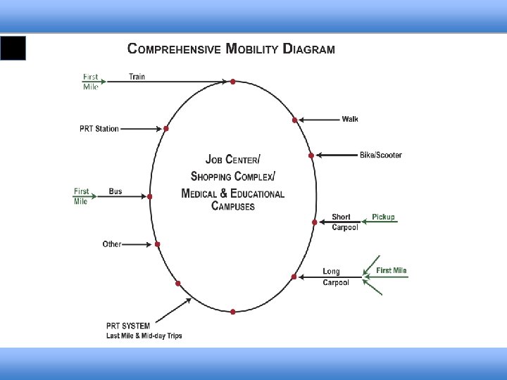 PRT ROLES § Collection-Distribution Function: Solves the ‘last-mile’ gap in most transit services, and can improve the “firstmile” gap also § Circulation Function: Connects major transit stops, stations and parking facilities with work, shopping, medical, education and other origin/destinations. § Shuttle Function: Connects heavy trip generation centers that are in relatively close proximity to each other.