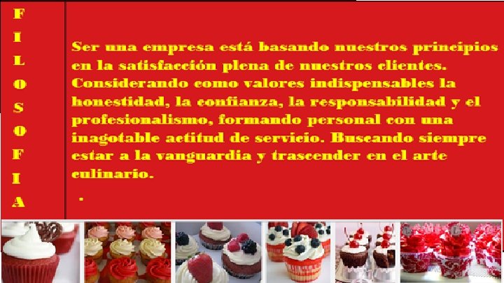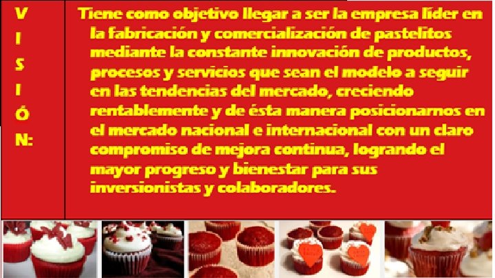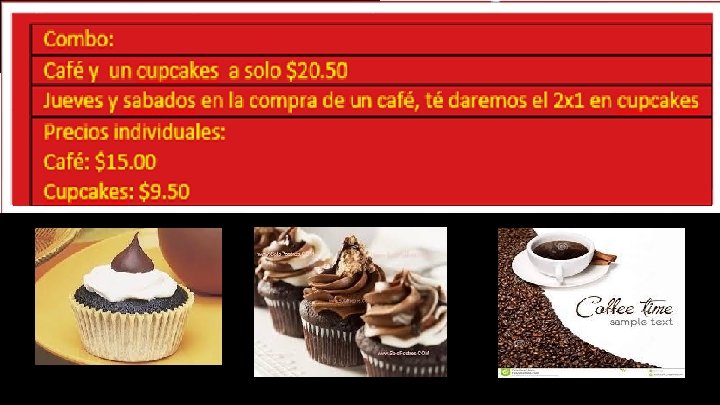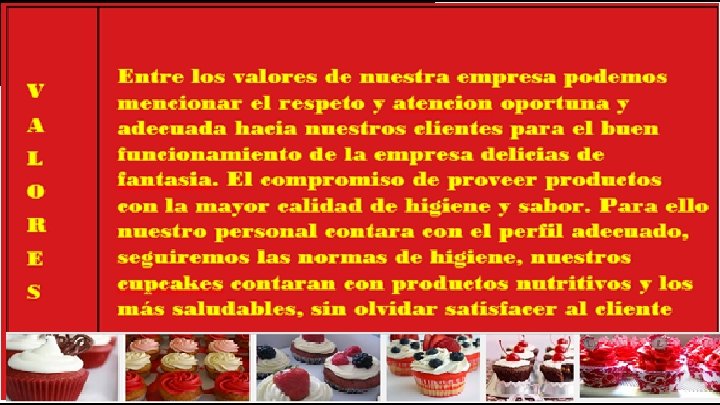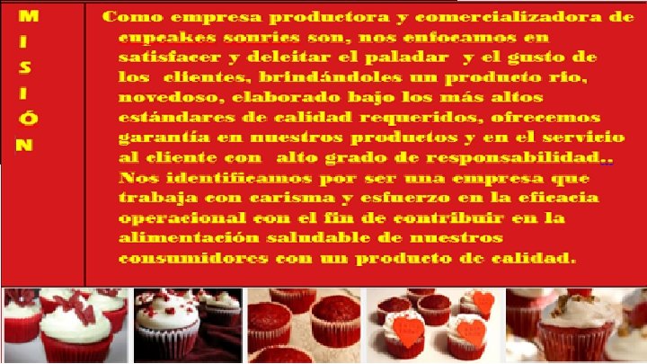 Modelo de negocio. Pastelería independiente. Ofrece cupcakes sonrics en porciones individuales. Elabora pedidos y diseños especiales para eventos sociales. También vende cupcakes, galletas finas y bebidas embotelladas como leche y café. Sus líneas alternas de negocio son la venta de café y helados. Público objetivo. Hombres y mujeres de todas las edades, de nivel socioeconómico A/B, C+ , C y D+; cafeterías, salones de fiestas, compañías de distribución. Infraestructura. nuestra microempresa se localiza en el interior de la unidad educativa profesor Porfirio o Morales localizada en Tehuacan Pue. Mexico Calle 5 de mayo Col. Serdan Equipamiento. Contamos con barra para el cliente si se desee ordenar nuestros menus asi como un mostrador practico estantes para la comercialización de nuestros productos y recipientes en donde nuestro público pueda consumir