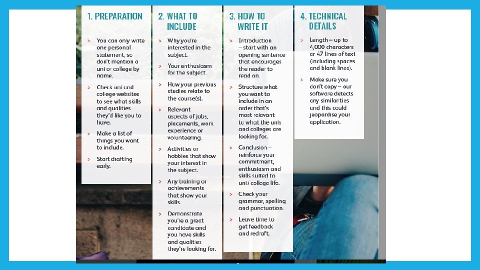 HOW TO WRITE IT • Your personal statement should be unique, so there’s no definite format for you to follow here – just take your time. Here are some guidelines for you to follow, but remember your personal statement needs to be ‘personal’. • Write in an enthusiastic, concise, and natural style – nothing too complex. • Try to stand out, but be careful with humour, quotes, or anything unusual – just in case the admissions tutor doesn’t have the same sense of humour as you. • Structure your info to reflect the skills and qualities the unis and colleges value most – use the course descriptions to help you. • Check the character and line limit – you have 4, 000 characters and 47 lines. Some word processors get different values if they don’t count tabs and paragraph spacing as individual characters. • Proofread aloud, and get your teachers, advisers, and family to check. Then redraft it until you’re happy with it, and the spelling, punctuation, and grammar are correct. • We recommend you write your personal statement first, then copy and paste it into your online application once you're happy with it. Make sure you save it regularly, as it times out after 35 minutes of inactivity.