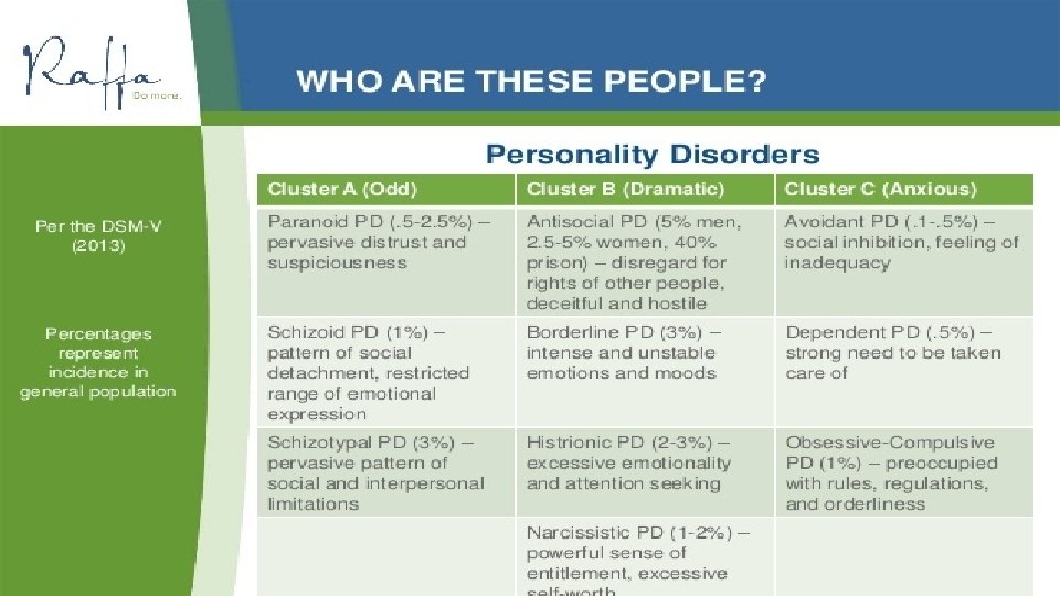Classifying Personality Disorders · The DSM-5 identifies ten personality disorders and separates these into three groups or “clusters”: · · · Odd or eccentric behavior · Paranoid, schizoid, and schizotypal Dramatic, emotional, or erratic behavior · Antisocial, borderline, histrionic, and narcissistic Anxious or fearful behavior · Avoidant, dependent, and obsessive-compulsive 8