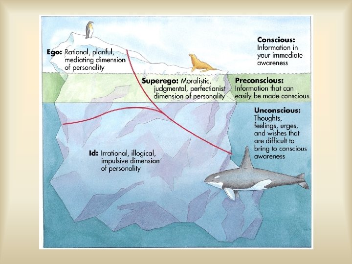Psychoanalytic Divisions of the Mind • Id—instinctual drives present at birth – does not distinguish between reality and fantasy – operates according to the pleasure principle • Ego—develops out of the id in infancy – understands reality and logic – mediator between id and superego • Superego – internalization of society’s & parental moral standards – – focuses on what the person “should” do Develops around ages 5 -6. Partially unconscious Can be harshly punitive using feelings of guilt