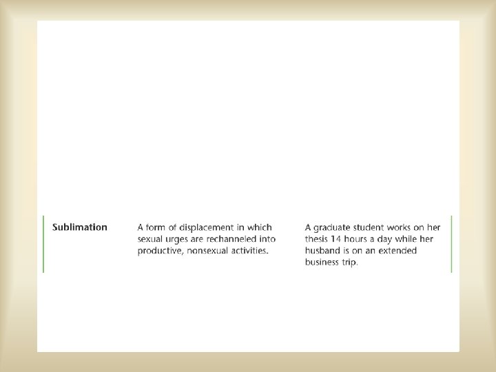 Sublimation • A form of displacement in which sexual urges are channeled into nonsexual activities that are valued by society