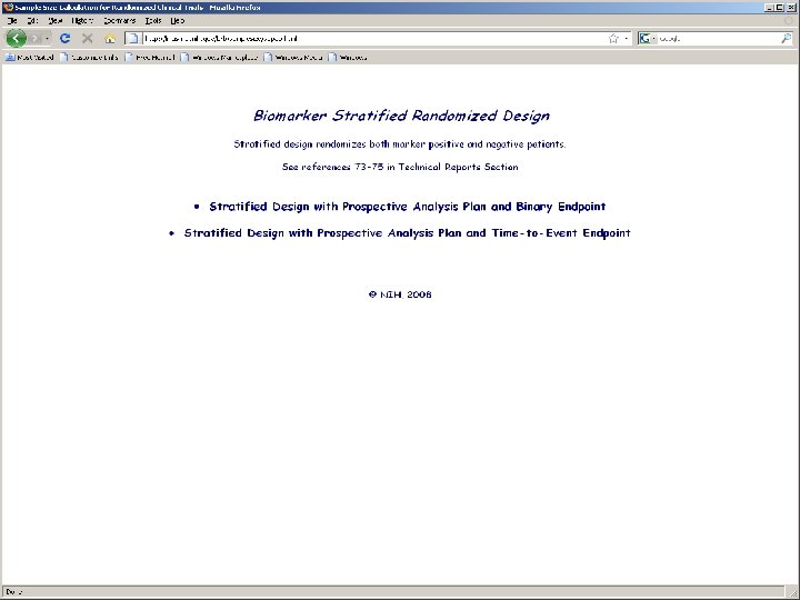 Evaluating the Efficiency of Targeted Design n Simon R and Maitnourim A. Evaluating the efficiency of targeted designs for randomized clinical trials. Clinical Cancer Research 10: 6759 -63, 2004; Correction and supplement 12: 3229, 2006 Maitnourim A and Simon R. On the efficiency of targeted clinical trials. Statistics in Medicine 24: 329 -339, 2005. reprints and interactive sample size calculations at http: //linus. nci. nih. gov
