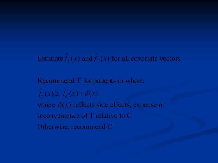With Binary Outcome n fj(x) = probability of response for patient with covariate vector x who receives rx j n Fit separately to data for patients in each treatment group in the training set n Logistic regression, stepwise logistic regression, L 1 penalized logistic regression, CART, random forest, etc n Fit jointly for patients in both treatment groups combined in the training set n Logistic model including treatment, selected main