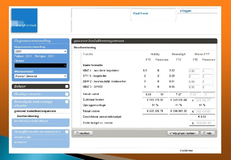 Gewenst basisdienstenpatroon In een werkblad wordt een herontwerp van de gewenste aanwezigheid van personeel gemaakt. Functies, werktijden, pauzes worden gekoppeld aan de bruto-netto berekening, werkgeverstoeslag etc. En doorgerekend naar formatiekosten per jaar. Zo ontstaat een onderbouwde begroting voor de werkeenheidsformatie.