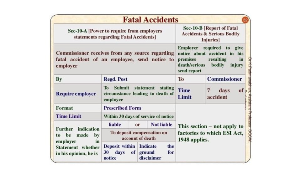 Procedure for calculation • Higher the age –Lower the compensation • -Relevant factor specified in second column of Schedule IV giving slabs depending upon the age of the concerned workman. • Example: In case of death: • -Wages Rs. 3000 PM • -Age 23 years • -Factor as schedule IV : 219. 95 * 1, 500 • -Amount of compensation Rs. 3, 29, 935. 00 • -In case of total disablement: Rs. 3, 95, 910. 00 • �Schedule II: List of persons engaged in different employment. • �Schedule III: List of occupational diseases. • �Schedule IV: Relevant factor.