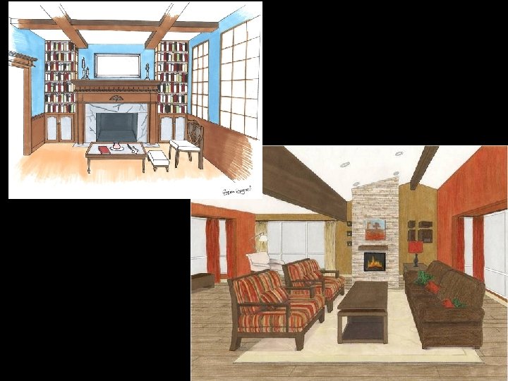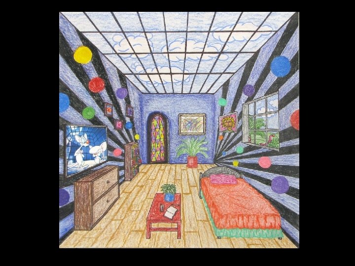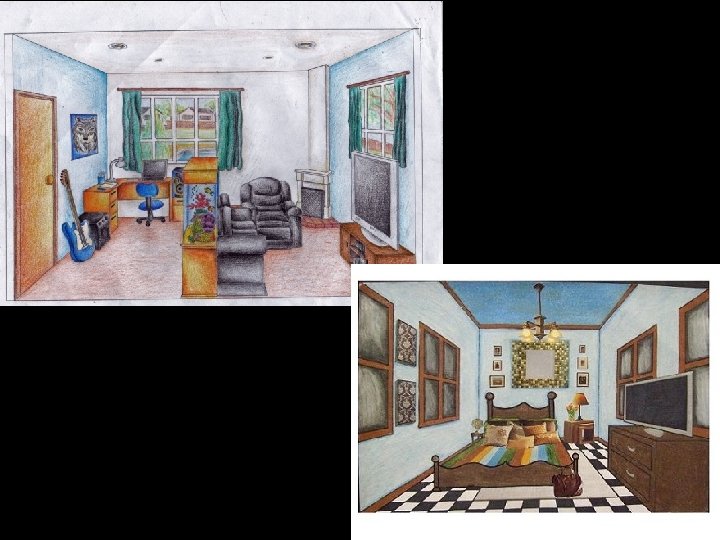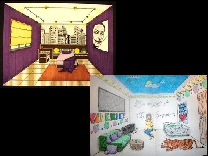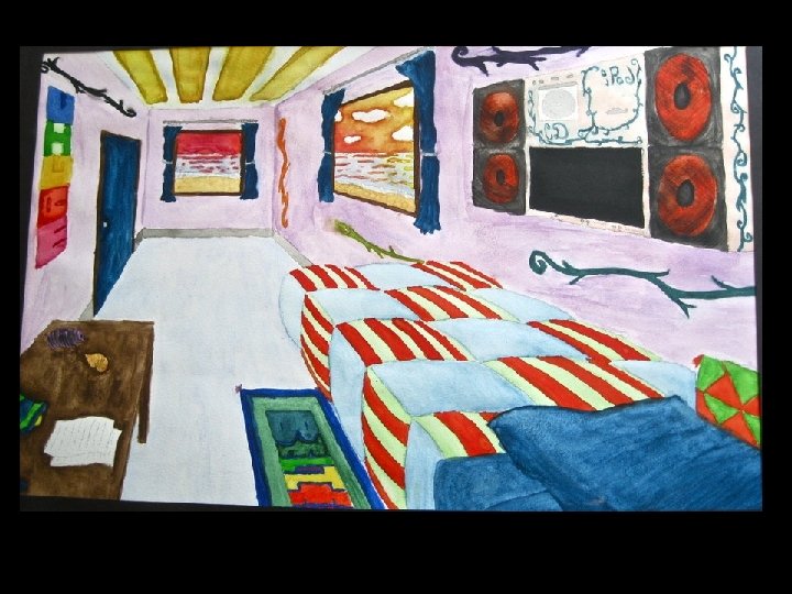 Creating My Perfect Room • Using one-point linear perspective, design and draw your perfect room. • Have the room reflect your personality and interests. • This room can be real or imagined. • Is it your man cave, bedroom, hunting trophy room, kitchen, workspace, classroom or walk in closet? • Is it your room on the space station? • What type of furniture, flooring, lighting, curtains, trim, windows, doors, and artwork does your room have? • Remember to use other techniques we discussed, like having objects overlap, to create pictorial space. • This drawing must be colored in using colored pencils.