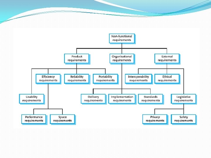 Non Fungsional Requirement § Product req. berkaitan dengan kehandalan, kecepatan, kemudahan digunakan, kapasitas memori yang dibutuhkan dan efisiensi sistem § Organisational req. berkaitan dengan standar, bahasa pemrograman dan metode rancangan yang digunakan. § External req. berkaitan dengan masalah etika penggunaan, interoperabilitas dengan sistem lain, legalitas, dan privasi.