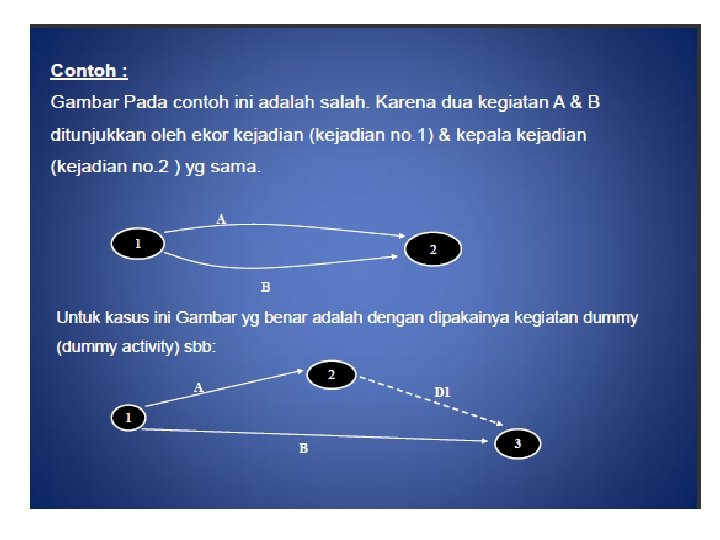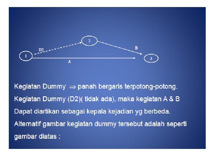 Activity on Node (AON) A B (f) C D Arti dari Aktivitas B dan C tidak dapat dimulai hingga A selesai. D tidak dapat dimulai sebelum B dan C selesai. Kegiatan dummy ditunjukan pada AOA. Activity on Arrow (AOA) A Dummy activity B D C
